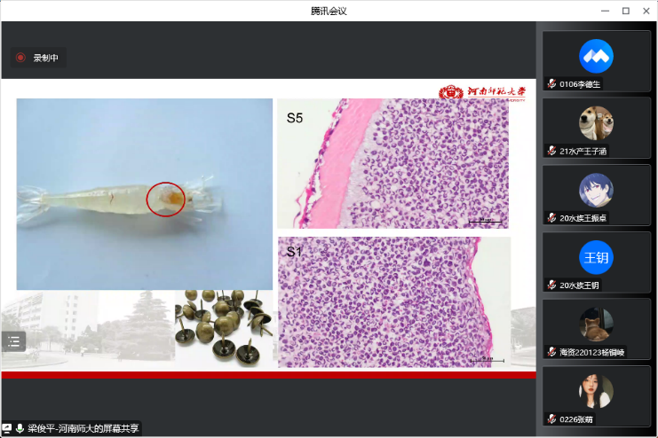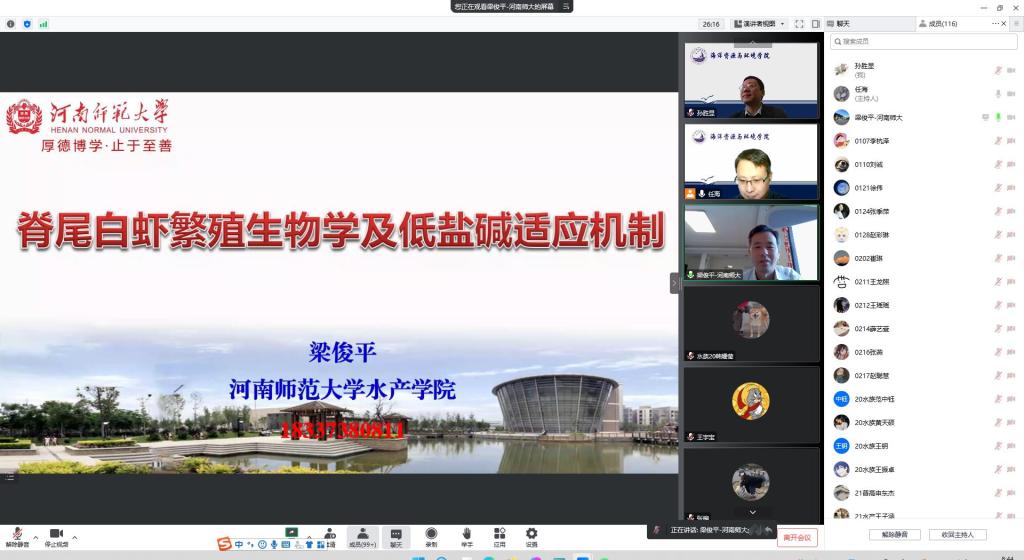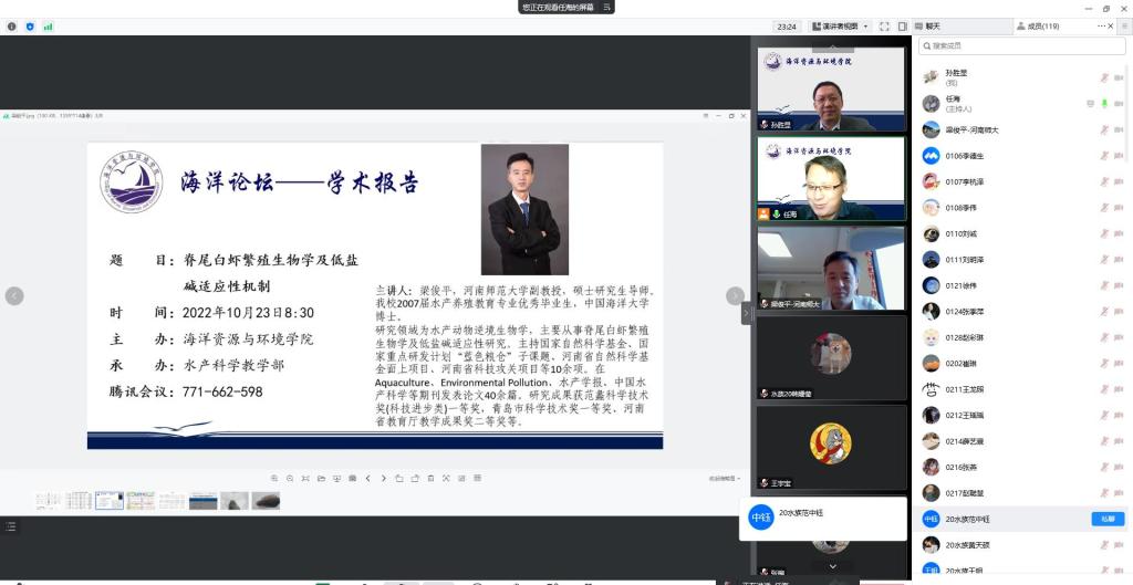 2022年10月23日上午,beat365官方网站三期海洋论坛活动在腾讯会议线上进行,本次活动邀请了优秀校友河南师范大学梁俊平博士给我院师生做学术报告。会议由水产科学教学部任海博士主持,水产科学教学部全体教师、渔业发展硕士研究生以及beat365官方网站本科生300余人收听了报告,学院党委副书记、副院长孙胜显出席会议。