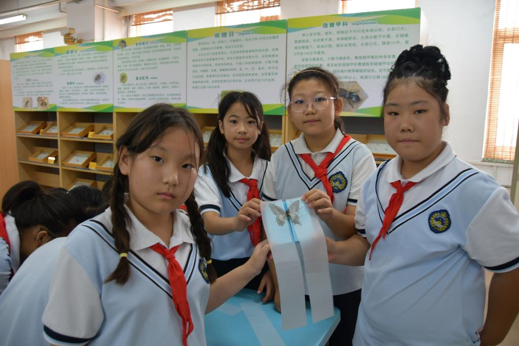 随后,工作人员将昆虫标本采集制作知识向小学生们进行了细致耐心的示范讲解。在志愿者的指导下,学生们亲手尝试制作蝴蝶标本。他们小心翼翼地操作,全神贯注地感受着科学与艺术的交融,完成了属于自己的第一件昆虫标本作品。