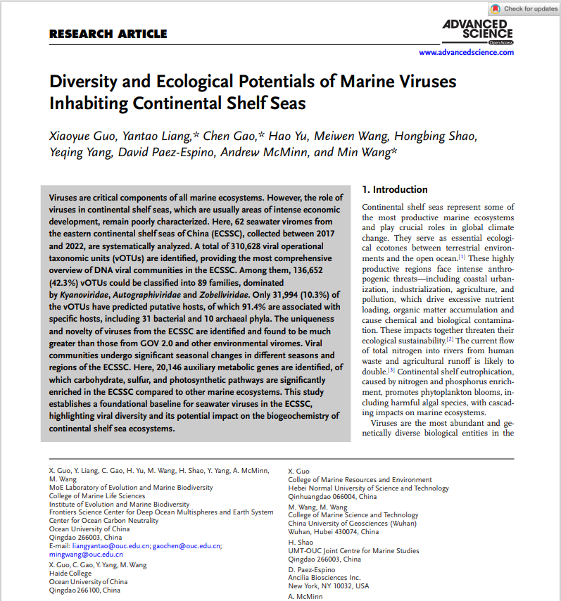 近日,beat365官方网站郭晓月博士在陆架海病毒研究领域斩获重要突破,其学术成果《Diversity and Ecological Potentials of Marine Viruses Inhabiting Continental Shelf Seas》(《陆架海海洋病毒的多样性及生态潜力》),发表在国际知名学术期刊Advanced Science(《先进科学》),beat365官网作为署名单位。该期刊作为中科院1区Top期刊,五年影响因子(IF5-year)达14.3的高水平,是全球行业内公认的高影响力权威学术平台。