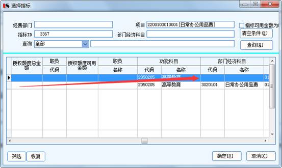 3、进入指标选项,系统根据所选ID号弹出显示1至多条带有经济科目的选项(取决于预算);同时也显示一条无经济科目的空白记录(该记录为合计栏),该条记录不允许选择,选择会显示报错提示
