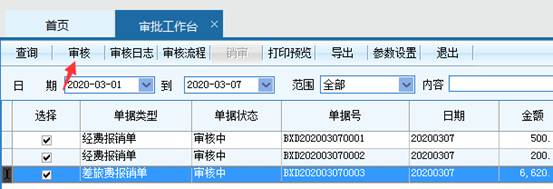 在审批工作台的未审核标签内,可以通过选择多个报销单,点击菜单项上的审核进行批量审核。