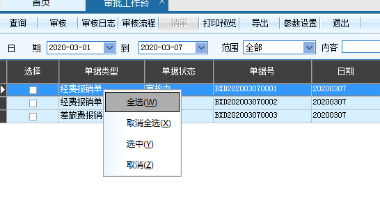 如果列表里所有的都需要批量审核,但是列表单据量很多的情况下,可以使用右击全选功能进行操作。